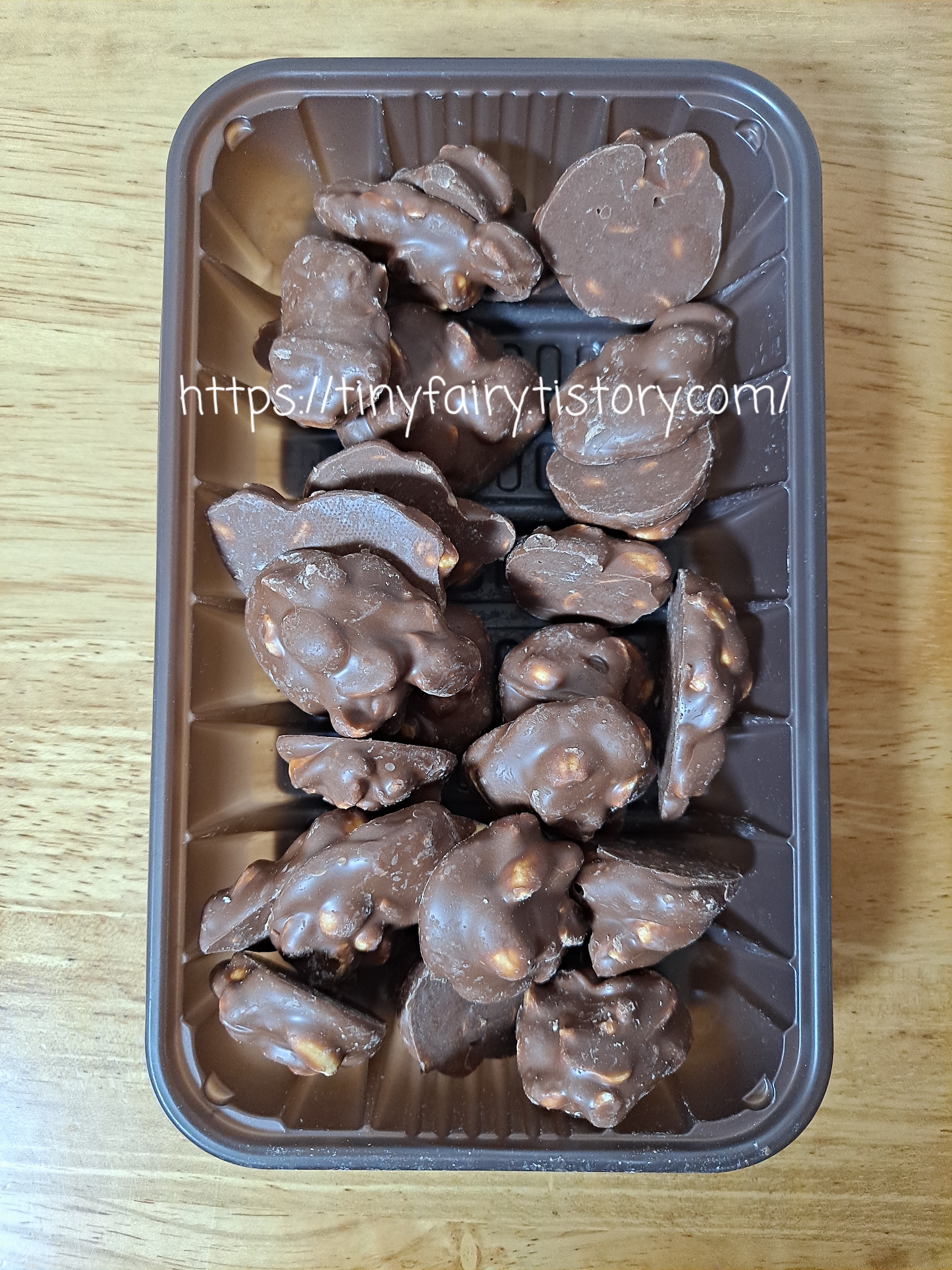그리고 견과류가 통째로 들어간 초콜릿 종류는 시중에서 쉽게 구할 수 있는데, 이렇게 잘라진 견과류가 들어간 초콜릿은 구하기가 어렵다. 체인점이 아닌 작은 가게에서 만들어서 팔 때에나 먹을 수 있었다. (발렌타인같은 날에나 돈을 좀 주고 먹어야했다.) 내가 아직 못 찾은 건지 모르겠지만, 공장에서 이렇게 포장해서 나온 상품을 발견해서 매우 기뻤다.