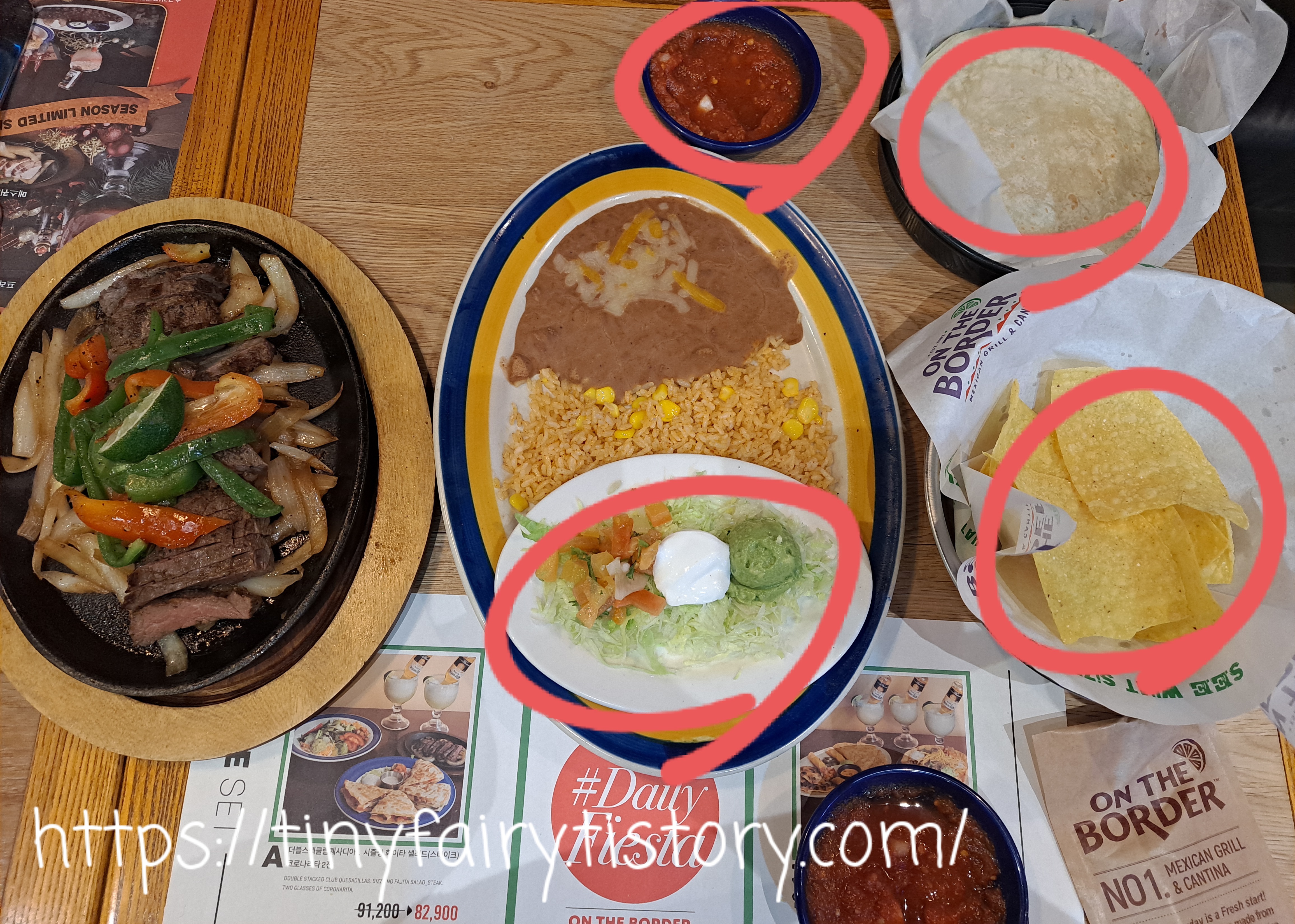 샤워크림, 과콰몰리, 토마토 살사, 또띠아 리필 가능합니다. (빨강색 동그라미친 거 리필 가능.)
