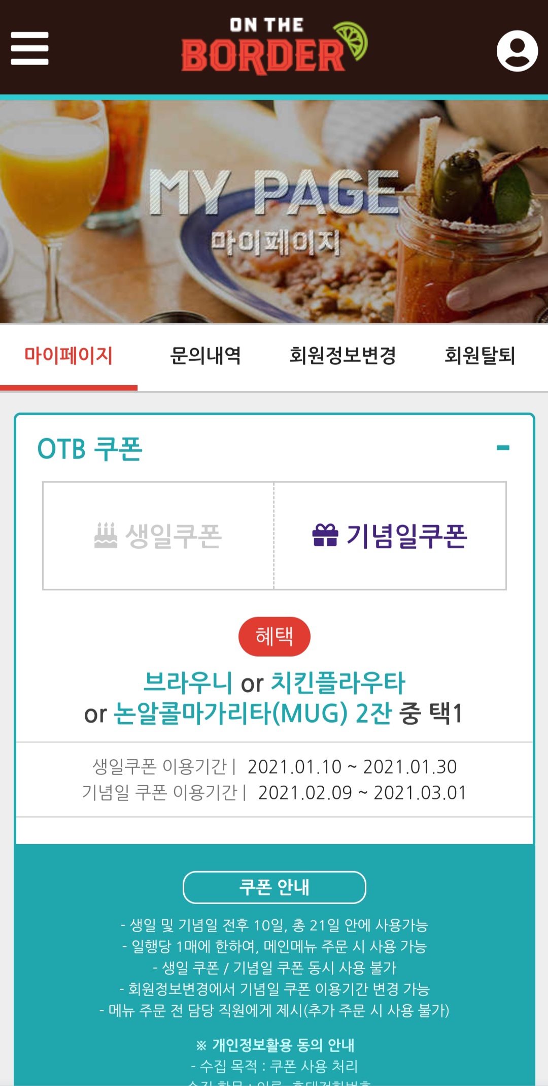 2. 생일 쿠폰/기념일 쿠폰: 홈페이지 회원가입 후 당일 사용 가능.