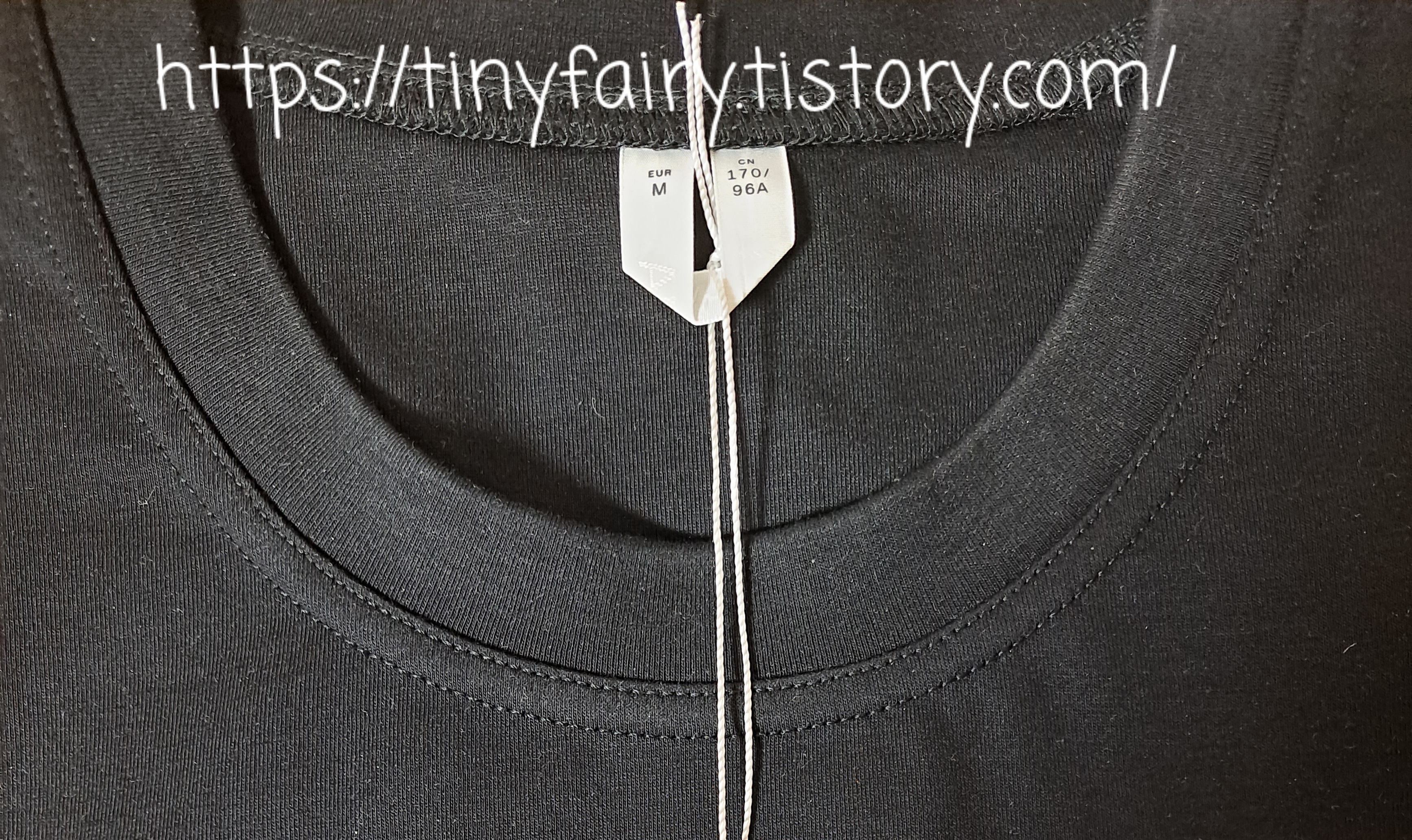 디테일: 넥라인이 이쁘다. 탄탄해서 잘 늘어나지 않을 것 같다. 근데, 목부분 안쪽 마감은 실이 다보여서 별로다. 가격도 비싼데, 깔끔하게 원단을 대서 마감했으면 좋을 텐데 아쉽다.
