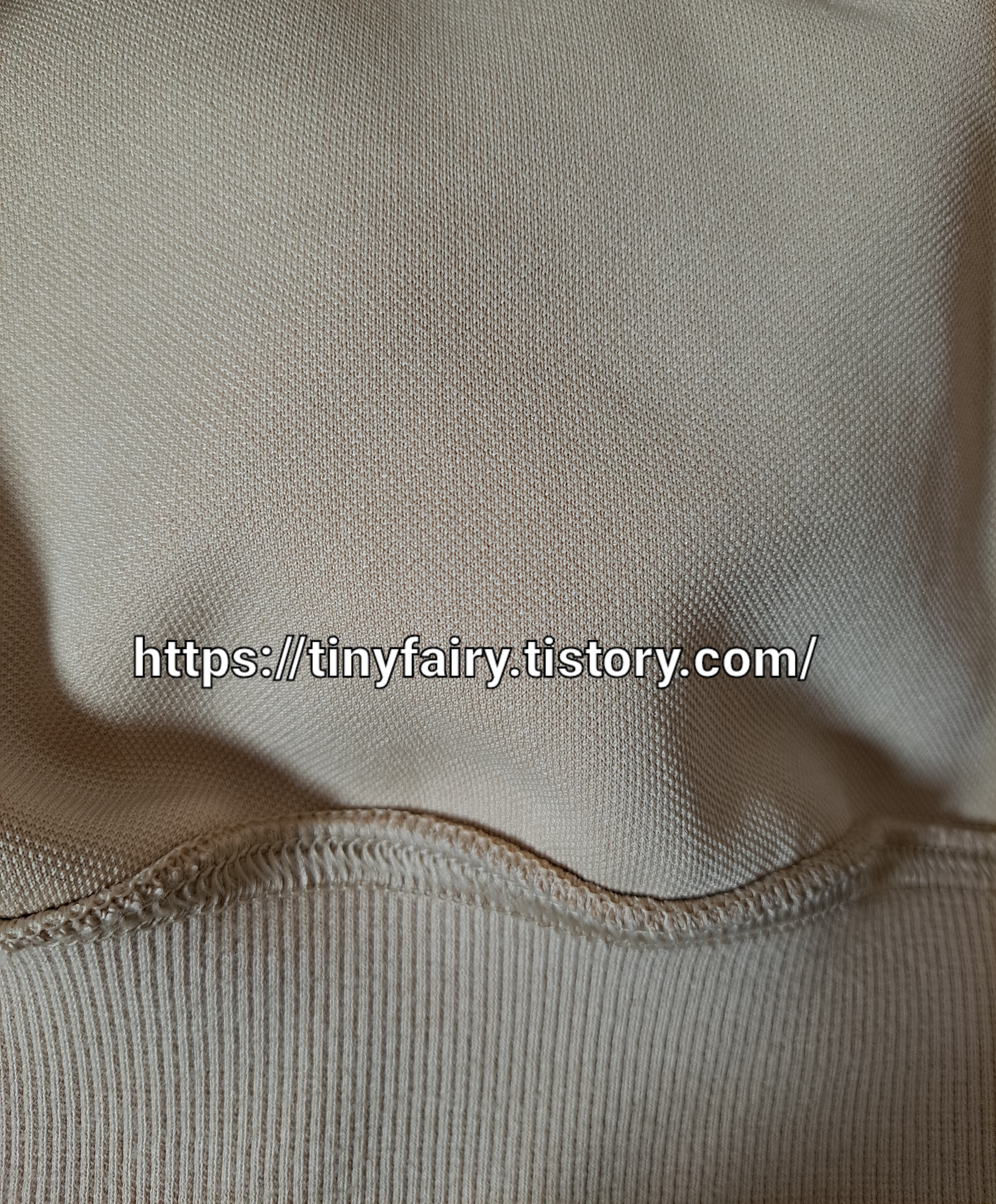 일반적인 맨투맨 재질은 아니에요. 아래 사진은 맨투맨 안에 원단을 찍은 건데, 테리가 아니죠? 잘 보면, 내부 마감도 깔끔하게 잘 되있어요.