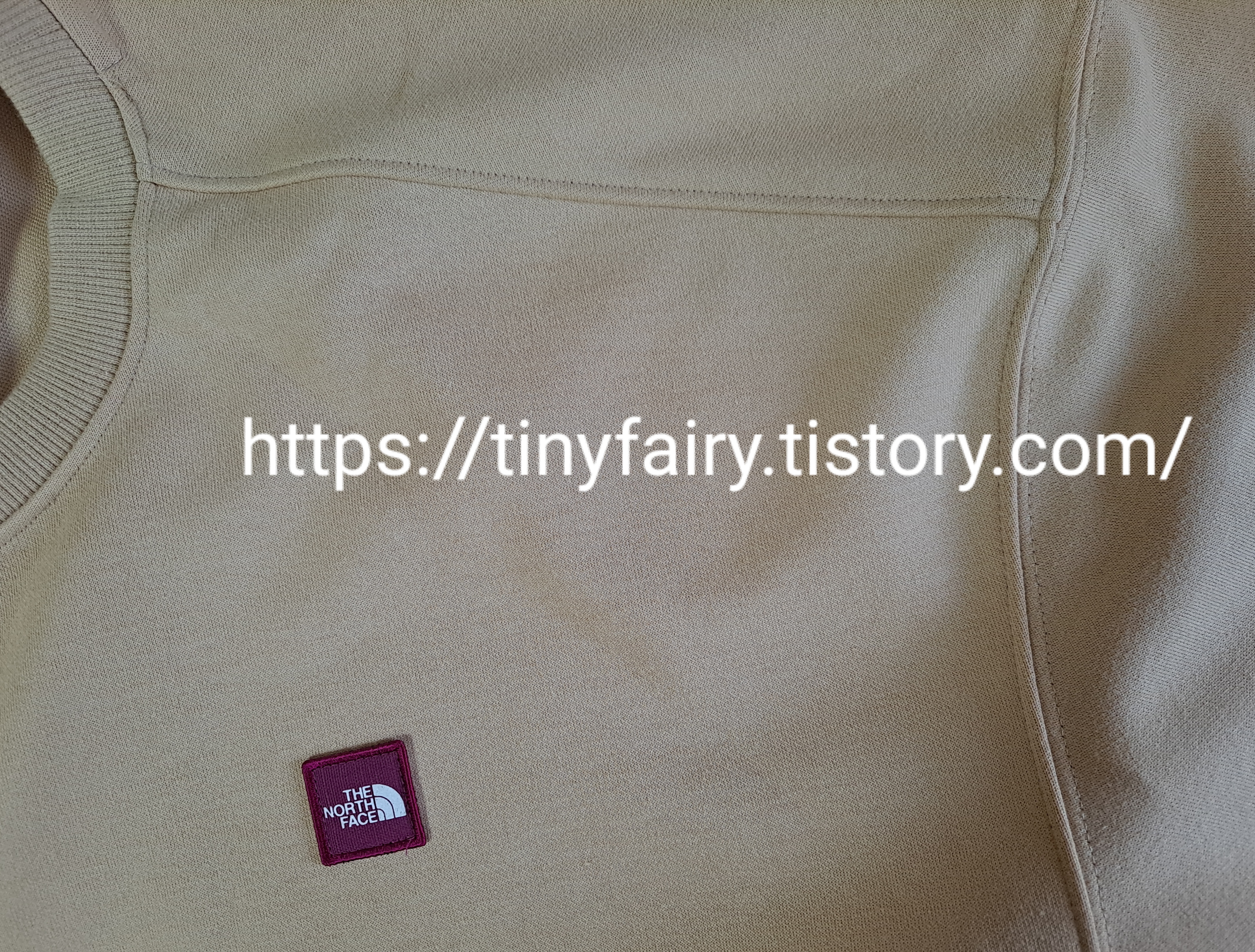 앞에서 얘기했듯이 로고랑 맨투맨 색 조합이 이뻐요. 베이지 바탕의 보라색 로고. 그리고 노스페이스 로고가 앞 뒤로 있는데, 크기가 크지 않고 눈에 띄진 않아서 좋아요.