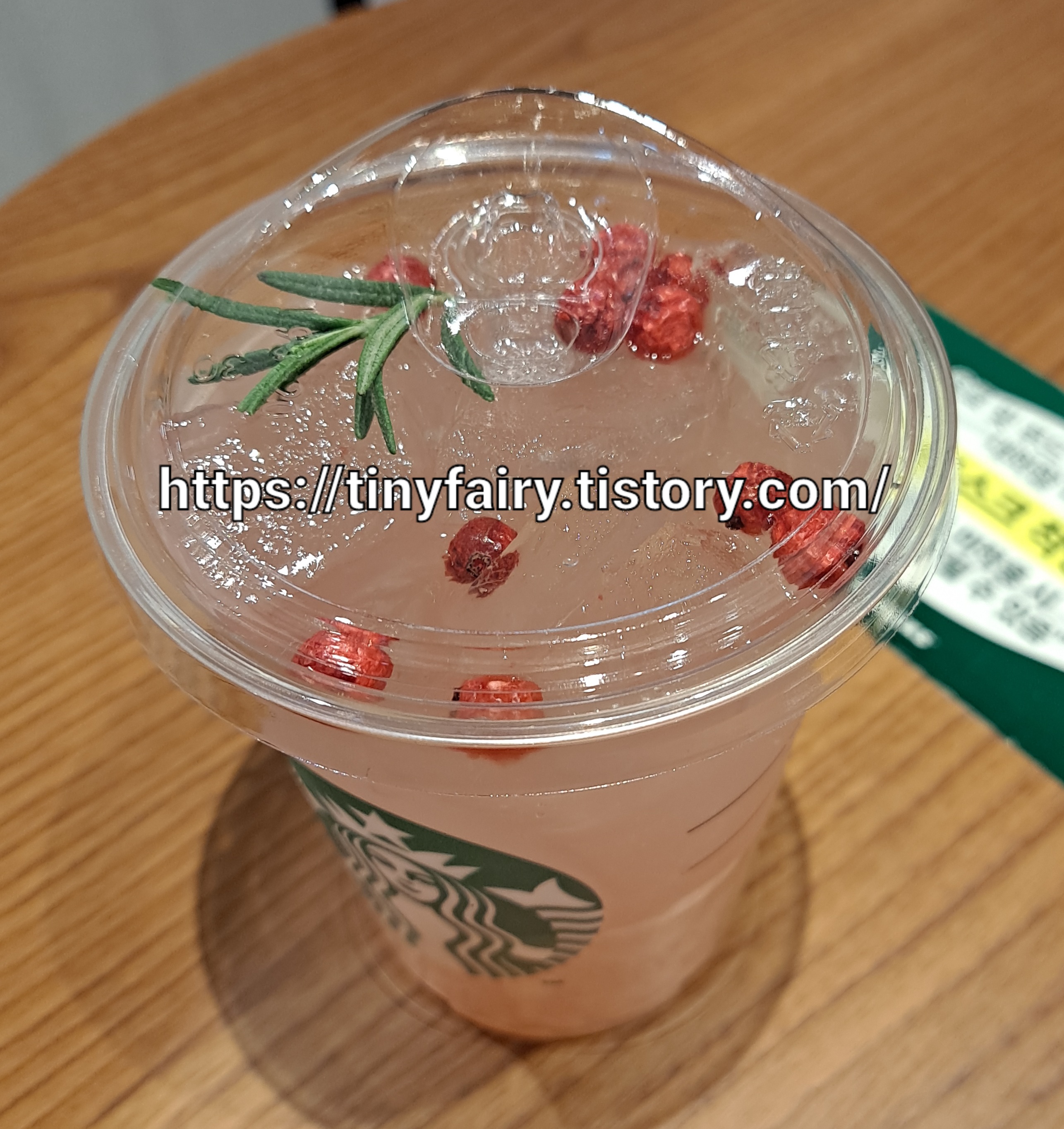 레드 커런트가 뭔지 궁금했는데, 앵두 말린거 같이 생겼는데, 그냥 음료 위에 둥둥 떠있는 장식 역할만 한다. 같이 떠있는 로즈마리 잎이랑 해서 크리스마스가 생각이 난다.