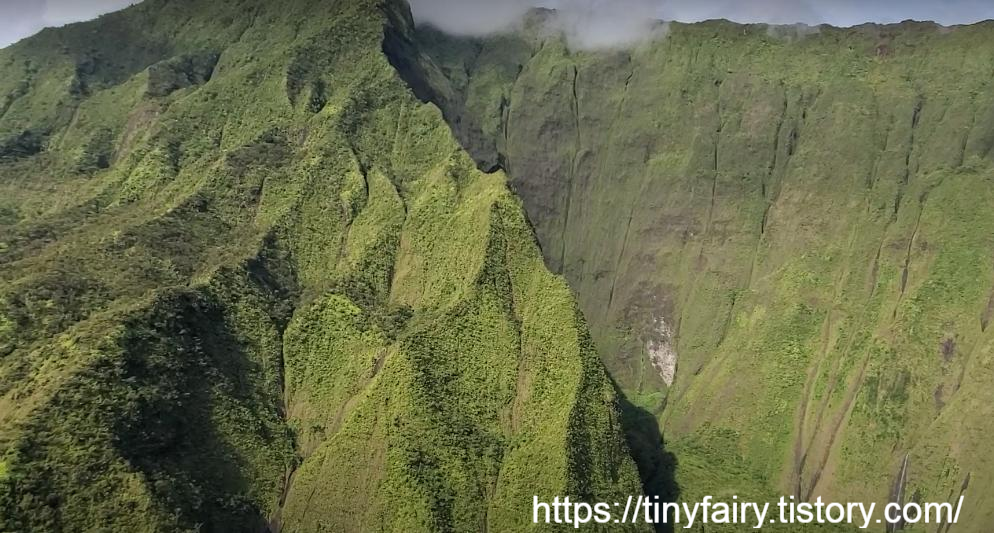 나팔리 코스트 정말 안쪽까지 들어가서 한 바퀴 돕니다. 사진을 잘 찍을 수 있게 헬기 조종사가 천천히 운전을 해줍니다. 유턴을 해서 왼쪽, 오른쪽 자리 상관없이 둘 다 골고루 감상할 수 있습니다. 티라노 사우루스가 발톱으로 긁은 것처럼 생겼습니다.