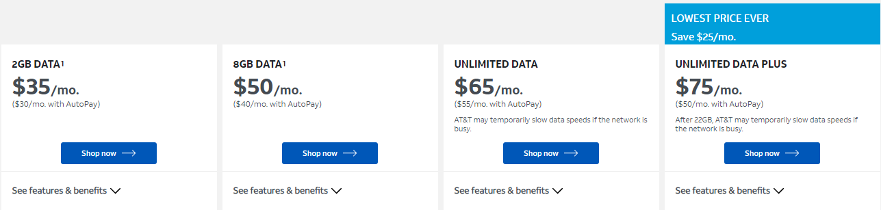 아래는 AT& T 공식 사이트에 가서 가져온 prepaid usim 요금제인데, 한달을 기준으로 되어 있네요. 저는 7일가도 한달 요금제로 그냥 구입을 해서 편하게 씁니다.