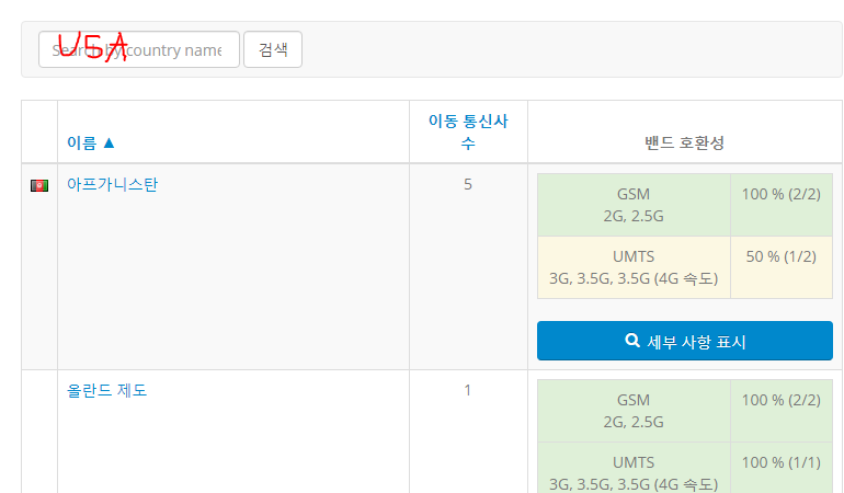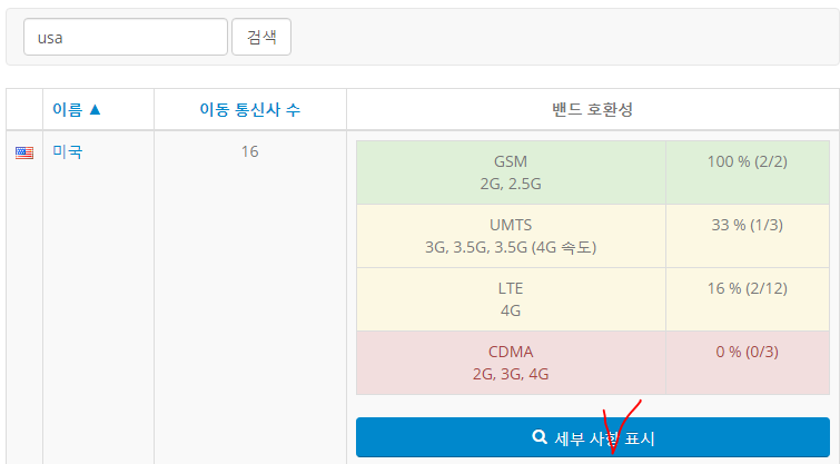 8. 그럼 왼편에는 통신사 이름과 그 옆에는 간단한 표로 호환성에 대해 알려줍니다. 제 핸드폰으로는 LTE가 25%의 확률밖에 안되니, 당연히 LTE가 되질 않았던 거군요. 미국의 인터넷 속도는 한국과 비교하면 안되지만, 그래도 미리 확인하여 최대한 빠른 인터넷을 쓸 확률을 높여봅시다.