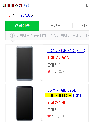 예를 들어, ‘g6’ 이런 식으로 치면, 네이버 쇼핑에 나옵니다.(아래 이미지에 노란색으로 칠해진 부분이 모델 명입니다.)