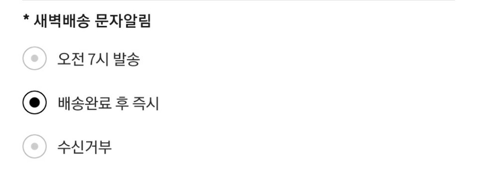 새벽 배송 문자 알림: 아래와 같이 선택 가능함.