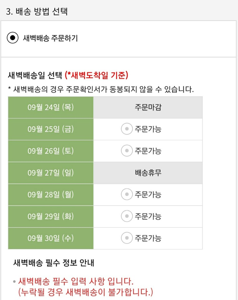 새벽 배송: 날짜 선택 가능. 가령, 내일 부터 약 일주일(일요일 제외) 사이의 날짜 선택 가능. 특정 날짜는 조기 마감되는 경우가 있음.