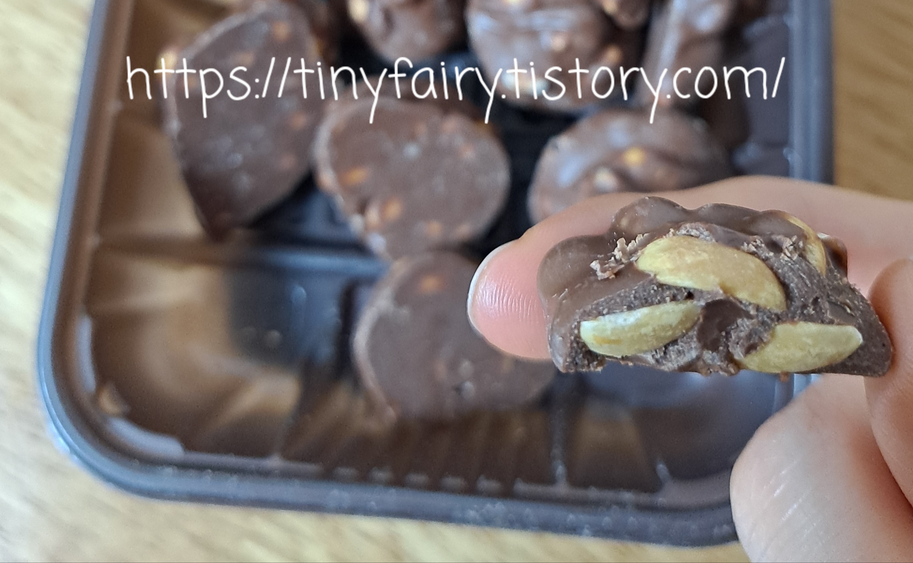 무인양품 식품류가 가성비도 좋고 맛도 괜찮다는 걸 봐서, 발렌타인 데이도 왔기에 겸사겸사 초콜릿을 사봤다. 초콜릿은 견과류가 들어가는 걸 좋아하는 편이라 별로 고민하지 않고 집었다. 이렇게 견과류가 들어간 초콜릿은 보통 비싼데, 견과류가 많이 들어갈 수록 더 맛있다. 견과류의 고소한 맛과 초콜릿의 달달한 맛이 어울러져서 계속 먹게 된다. 그리고 견과류가 통째로 들어간 초콜릿 종류는 시중에서 쉽게 구할 수 있는데, 이렇게 잘라진 견과류가 들어간 초콜릿은 구하기가 어렵다. 체인점이 아닌 작은 가게에서 만들어서 팔 때에나 먹을 수 있었다. (발렌타인같은 날에나 돈을 좀 주고 먹어야했다.) 내가 아직 못 찾은 건지 모르겠지만, 공장에서 이렇게 포장해서 나온 상품을 발견해서 매우 기뻤다. 견과류가 많이 들어간 초..